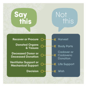 While some of these organ donation terms may be used and accepted medically, they aren’t appropriate to use out of respect for the donor families, especially when referring to their loved one’s organs. We’ve heard feedback from donor families that terms such as “harvest” make them feel like their loved one is equated with a crop. Using terms like “recover,” “procure” and “donated organs and tissues” instead, helps loved ones and the general public understand that the entire donation process is respectful and that donors and their families are treated with the utmost care.