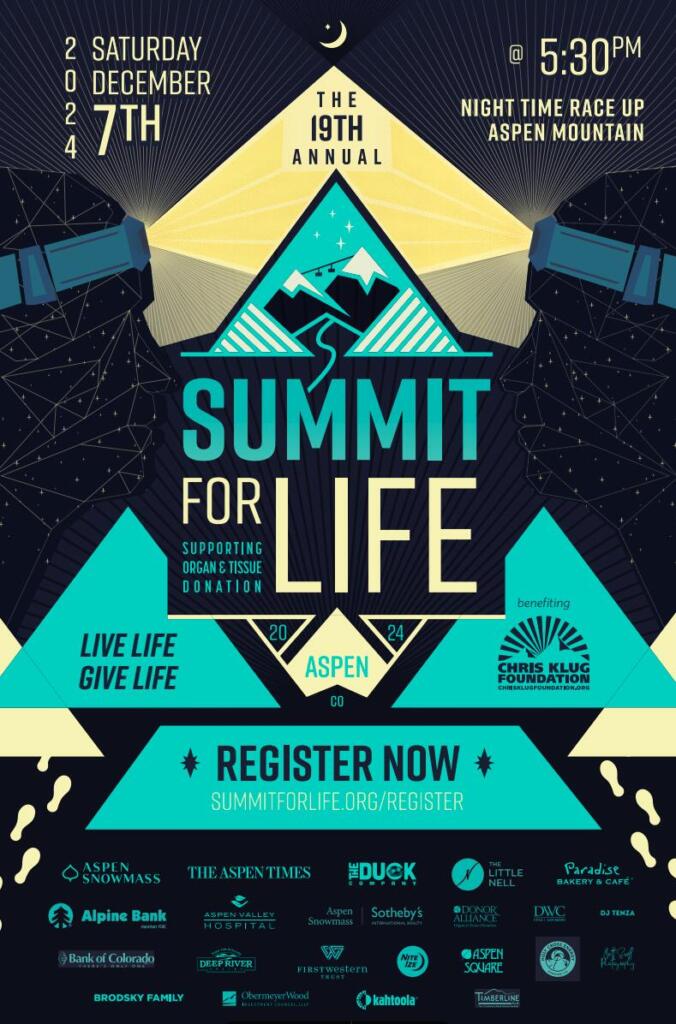 Donor Alliance will be joining our partner at Chris Klug Foundation at this wonderful event in Aspen, CO! Summit for Life (S4L) is a nighttime uphill race up Aspen Mountain on Saturday, December 7, and the biggest awareness and fundraising event of the year for the Chris Klug Foundation. Join hundreds of racers as they skin, snowshoe, run, or hike the 3,267 feet from Gondola Plaza to the Sundeck. (View course map HERE.) Then join the party with a dinner catered by The Little Nell, live music, and the awards ceremony. Afterwards, ride the Silver Queen gondola back to the base, and enjoy breathtaking views of Aspen at night.